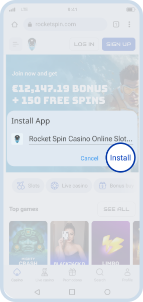 Allez sur la page d’accueil de Rocket Spin et appuyez sur les trois points pour ouvrir le menu du navigateur.