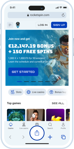 Ouvrez rocketspin.com avec Safari et appuyez sur « Partager » dans le panneau de navigation inférieur.